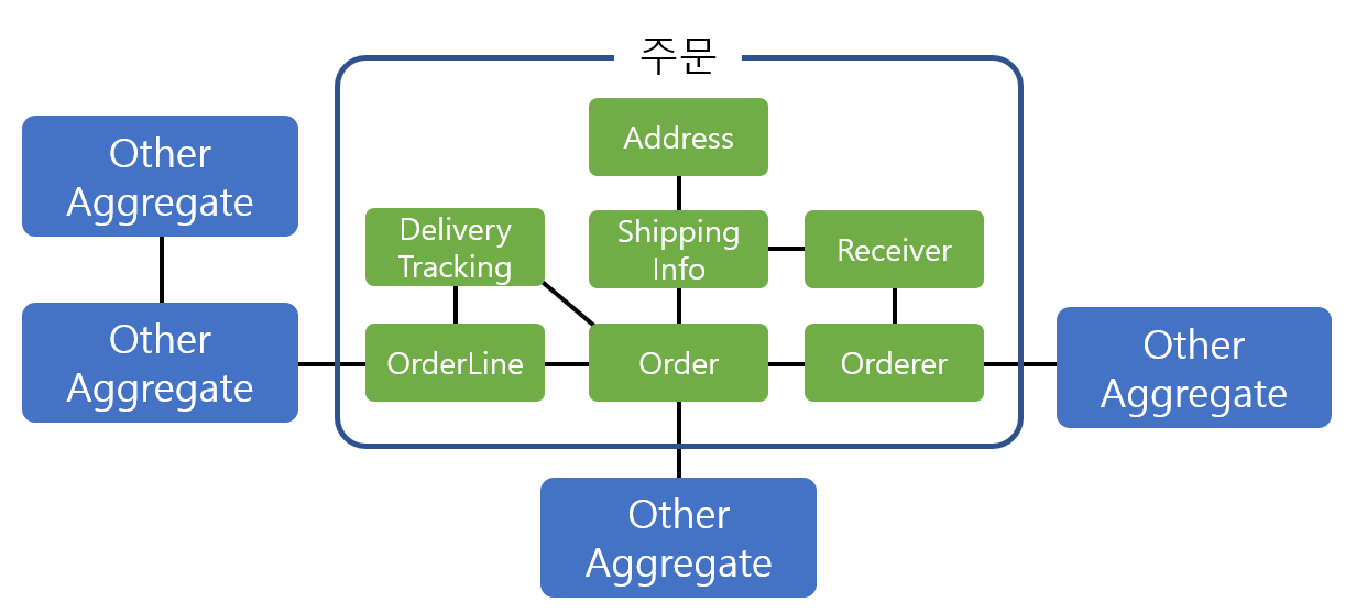 애그리거트는 관련 객체를 하나로 묶은 것을 말한다. 대표적인 예로 주문, 배송지 정보, 주문 목록, 총결제 금액을 포함하고 있는 주문을 들 수 있다.