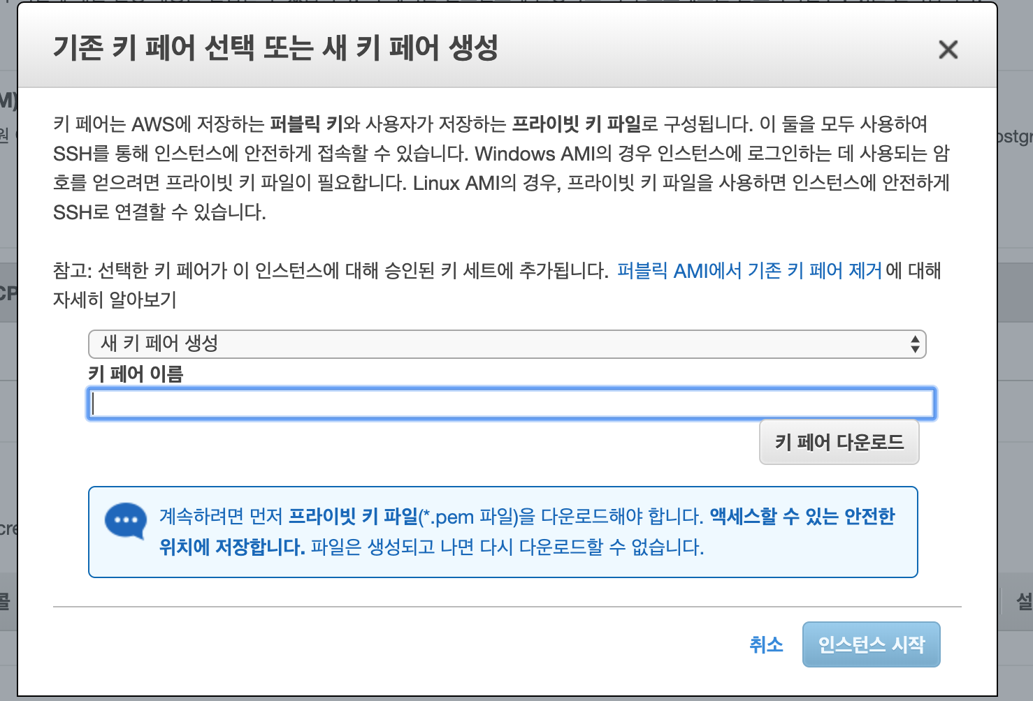 이렇게 뜨는데 새 키 페어 생성을 누르고 키페어 이름을 입력하고 다운받고 시작한다.
